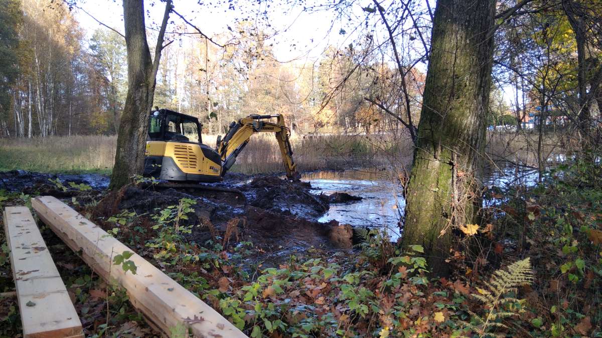 Baggerarbeiten zur Entschlammung eines Waldbadteich im Projekt MoSaiKTeiL