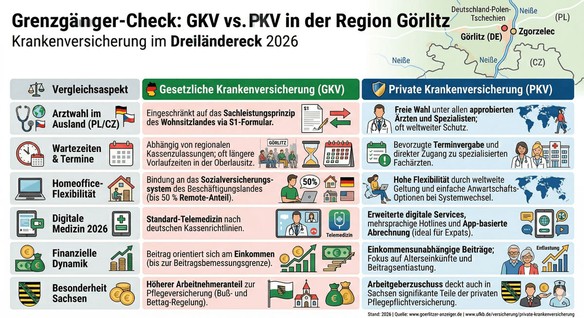 Görlitz, 27. März 2026. Görlitz hat sich in den letzten Jahren weit über seine Rolle als filmreife Kulisse hinausentwickelt. Als Herzstück des Dreiländerecks Deutschland-Polen-Tschechien zieht die Stadt verstärkt hochqualifizierte Fachkräfte an – von Forschenden für die neuen Großforschungszentren bis hin zu spezialisierten Ingenieuren im Schienenfahrzeugbau. Doch die Arbeit in einer Grenzregion bringt spezifische Herausforderungen mit sich, besonders wenn es um die soziale Absicherung geht. Im Jahr 2026 stehen Grenzgänger und Expatriates vor einer komplexen Rechtslage, die eine genaue Planung der Krankenversicherung erfordert.