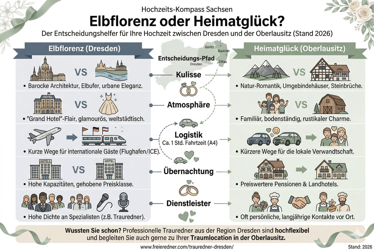 Görlitz, 27. März 2026. Die Hochzeitsplanung in der Oberlausitz hat im Jahr 2026 eine neue Dynamik gewonnen. Während die Region zwischen Görlitz, Bautzen und Zittau mit authentischem Charme und Naturverbundenheit punktet, lockt die Landeshauptstadt Dresden weiterhin mit barocker Opulenz und einer hohen Dichte an spezialisierten Dienstleistern. Für viele Paare stellt sich daher die grundlegende Frage: Soll das Ja-Wort in der vertrauten Heimat oder vor der weltberühmten Kulisse von „Elbflorenz“ gegeben werden?