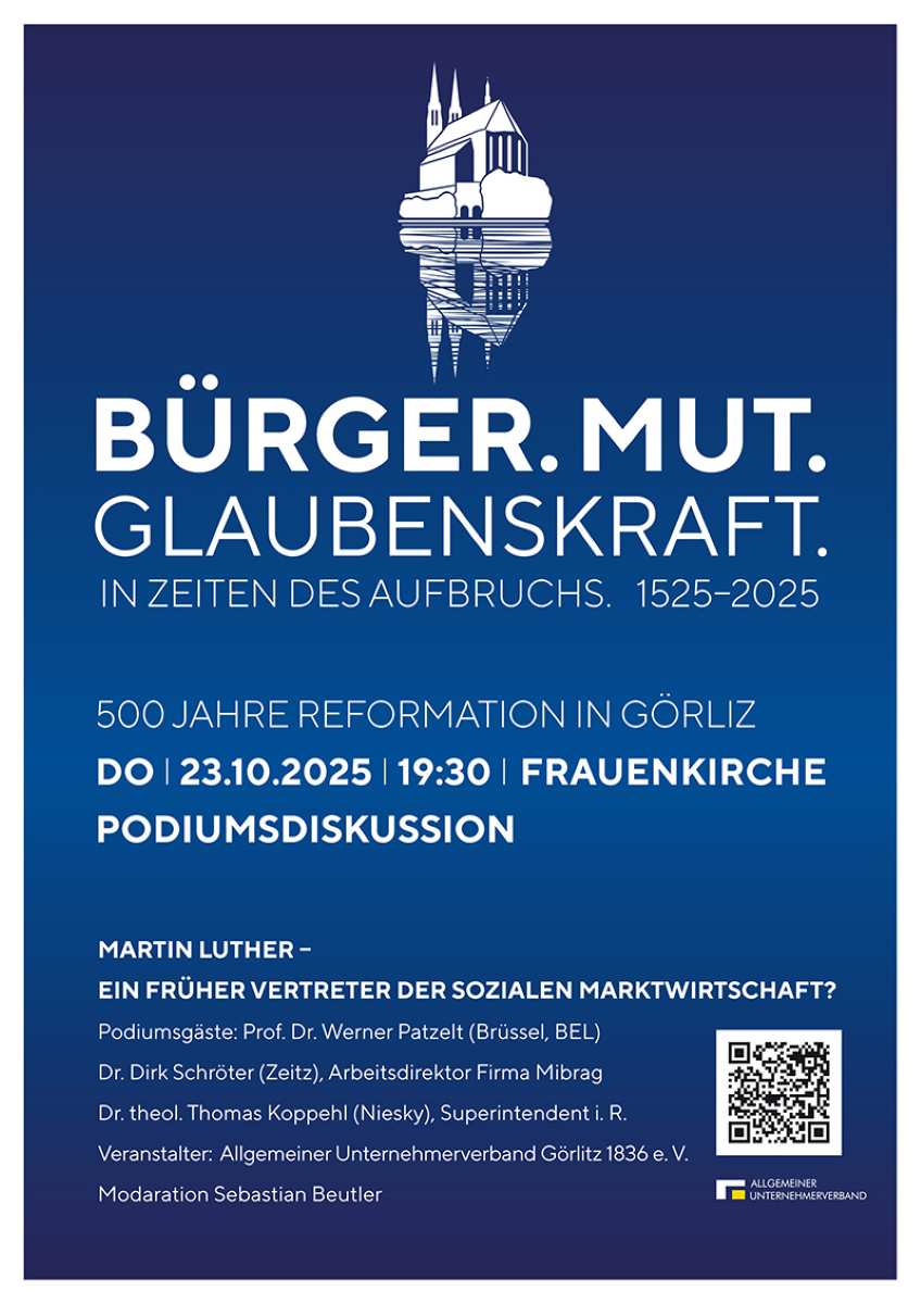 Görlitz, 6. Oktober 2025. Der Allgemeine Unternehmerverband Görlitz 1836 e. V. lädt am Donnerstag, dem 23. Oktober 2025, um 19:30 Uhr zu einem öffentlichen Unternehmerabend in die Frauenkirche Görlitz ein. Anlass ist das 500-jährige Reformationsjubiläum. Die Veranstaltung trägt den Titel „Martin Luther – ein früher Vertreter der Sozialen Marktwirtschaft?“.